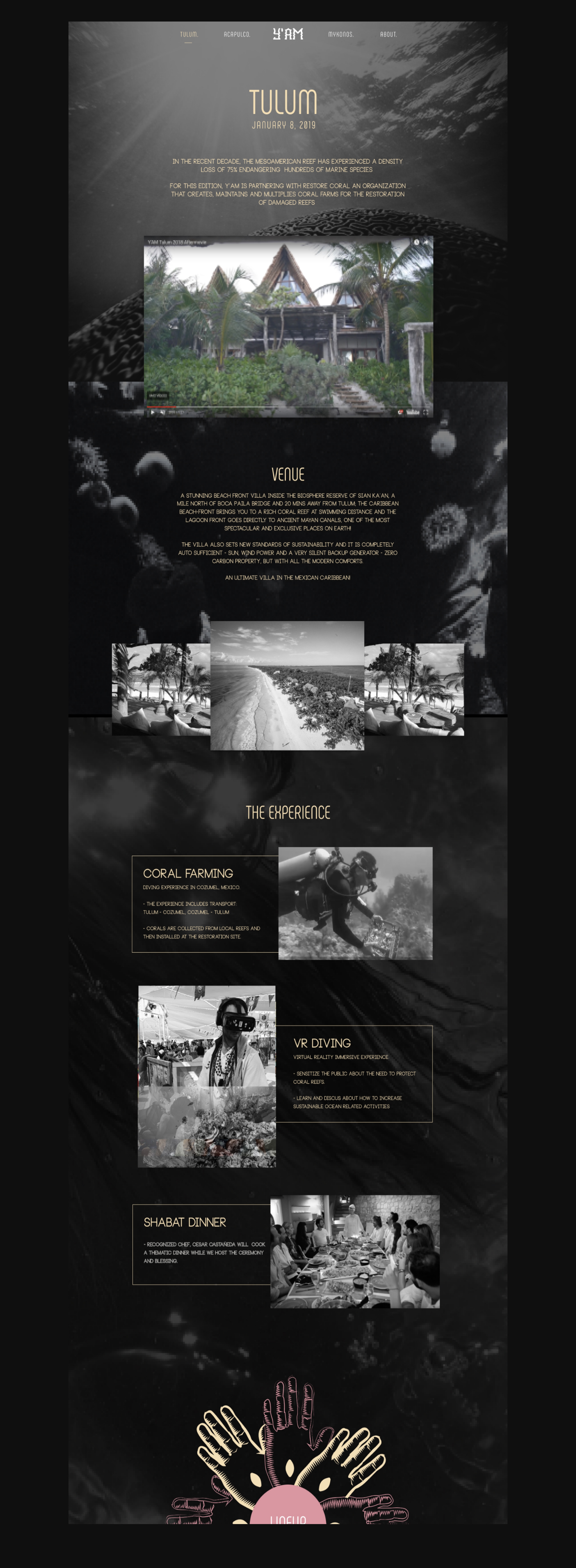 The design solution was to create a one-page website, and as you scroll you discover the different activities of the festival, the visual design relies strongly upon nature and sea elements but we decided to make everything on black and white to give it a mystic/luxury look and feel.